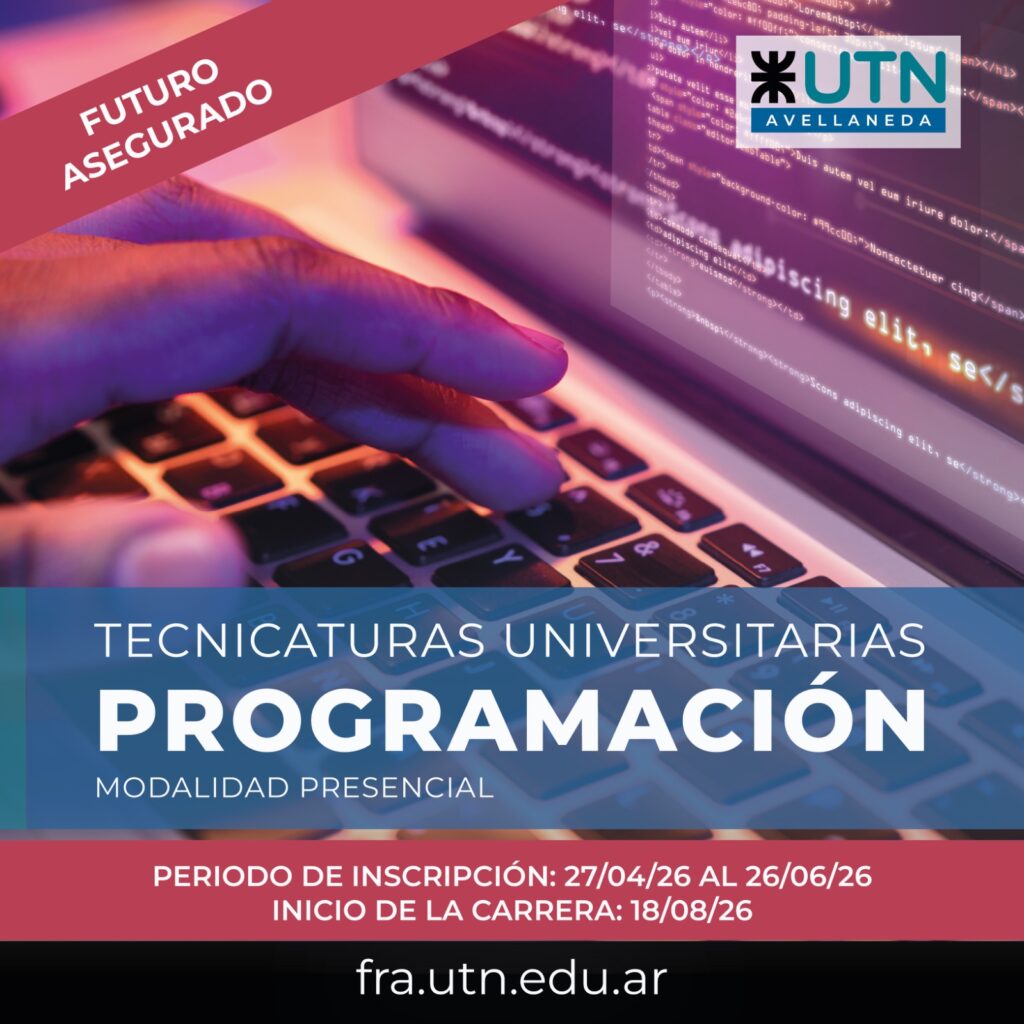 ESTUDIANTES 24 de abril 2026 TECNICATURA UNIVERSITARIA EN PROGRAMACIÓN, MODALIDAD PRESENCIAL: INSCRIPCIÓN AL SEMINARIO DE NIVELACIÓN DE INVIERNO La carrera es dictada por la UTN Avellaneda. Del lunes 27 de abril al viernes 26 de junio estará abierta la inscripción al Seminario de Nivelación de la Tecnicatura Universitaria en Programación, modalidad presencial, que organiza la UTN Avellaneda con el objetivo de formar profesionales con capacidad para aplicar y gestionar tecnologías y lenguajes de programación de software y sistemas en el ámbito diario de las organizaciones. La carrera inicia el 18 de agosto, tiene una duración de dos años, y ofrece un amplio campo de desarrollo laboral, económico y social; al graduarse se obtienen los conocimientos para analizar situaciones complejas y aportar soluciones informáticas a los desafíos técnicos que presenta la programación, además de poder trabajar en equipo en proyectos de desarrollo de software. El requisito para comenzar la Tecnicatura es la aprobación del Seminario, que se compone de tres módulos (Formalización de algoritmos, Lectura comprensiva y Matemática inicial) y se dictará en modalidad virtual, sincrónica y asincrónica, del 6 de julio al 1 de agosto; los horarios disponibles son en turno mañana (8.30 a 12.30 h), tarde (14 a 18 h) y noche (18.30 a 22.30 h). Podrán inscribirse quienes aspiren a cursar por primera vez la carrera, así como personas reinscriptas que hayan cursado el Seminario a principios de 2026, o en instancias anteriores, y adeuden alguno de los módulos. Para acceder a los requisitos e instructivos de inscripción ingresar en https://fra.utn.edu.ar/tup-inscribirme/ Por más información comunicarse a administracion-tup@fra.utn.edu.ar