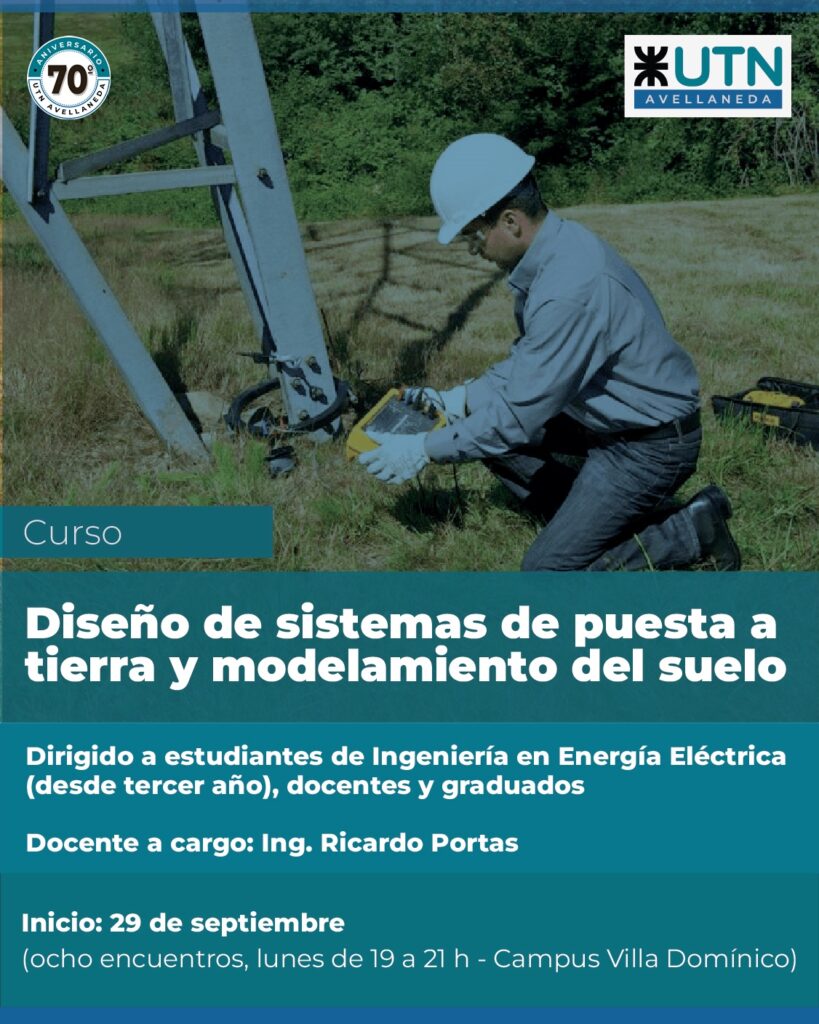 ESTUDIANTES 29 de agosto de 2025 CURSO DE DISEÑO DE SISTEMAS DE PUESTA A TIERRA Y MODELAMIENTO DEL SUELO Organizado por el Departamento de Ingeniería en Energía Eléctrica, podrán participar estudiantes de la carrera (a partir de tercer año), graduados y docentes. Docente a cargo: Ing. Ricardo Portas. Temario: 1.Modelamiento del suelo.2.Diseño de sistemas de PAT en baja tensión.3.Diseño de sistemas de PAT para subestaciones según Normas AEA-IEC e IEEE.4.Diseño de sistemas de PAT mediante software ASPIX.5.Consideraciones de los sistemas de PAT en instalaciones electrónicas.6.Medición de sistemas de PAT en instalaciones de baja tensión, subestaciones de Alta tensión y sus consideraciones.7.Medición de resistividad de terreno y manejo de datos (Teoría).8.Medición de tensiones de paso y contacto según norma AEA (Teoría).9.Mediciones de resistencia de PAT en líneas de alta tensión (Teoría).10.Experiencia práctica N°1: Soldadura exotérmica en el campus de la U.T.N. F.R.A.11.Experiencia práctica N°2: Medición de resistencia de un sistema de PAT combinado (Anillo más electrodos).12.Experiencia práctica N°3: Medición de resistividad de terreno por el método de Wenner. Inicio: 29 de septiembre – Ocho encuentros, hasta el 17 de noviembre (lunes de 19 a 21 h, Campus Villa Domínico). Cupos limitados / Para participar inscribirse en https://forms.gle/3uTEAtrSzwtS7FMN9