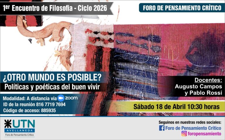 El sábado 18 de abril a las 10.30 h se realizará el primer encuentro de Filosofía organizado por el Foro de Pensamiento Crítico de la UTN Avellaneda, titulado “¿Otro mundo es posible? Políticas y poéticas del buen vivir”.