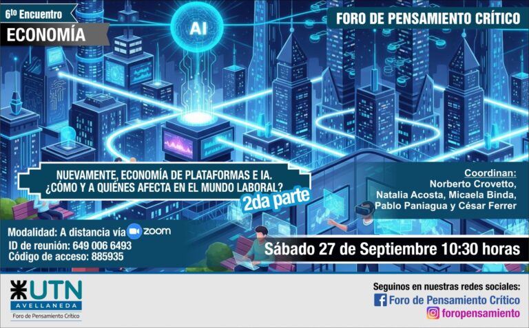El sábado 27 de septiembre a las 10.30 h se realizará el sexto encuentro de Economía organizado por el Foro de Pensamiento Crítico de la Facultad Regional Avellaneda de la Universidad Tecnológica Nacional.