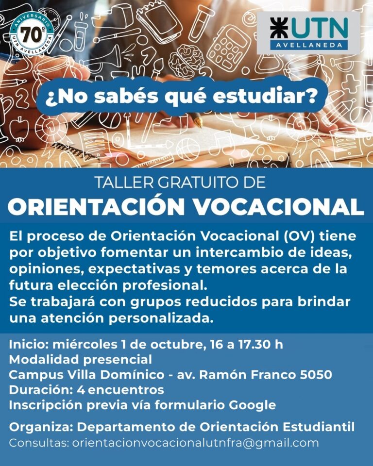 La UTN Avellaneda, desde su Departamento de Orientación Estudiantil, organiza una nueva edición del taller gratuito de Orientación Vocacional dirigido a jóvenes que aún no tienen decidido qué carrera estudiar.